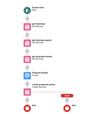 Screen flows require user interaction and provide interfaces for managing proposals, booking requests, and worker actions.