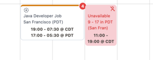 siteTimezoneFieldPathyou can now define the field responsible for applying a time offset to a given record. For shifts, when a Site record is linked and the Site has a timezone assignment, we will show two sets of times on the scheduler: the top one is the time in the current user location (or user preference, dependent on the timezonePreference setting) and the second line displays the time in the shift's site timezone. Similarly, for employee requests, we will use the Contact timezone to display the time off request in the current user's timezone as well as in the contact's assigned timezone.- "shift" schedulable use